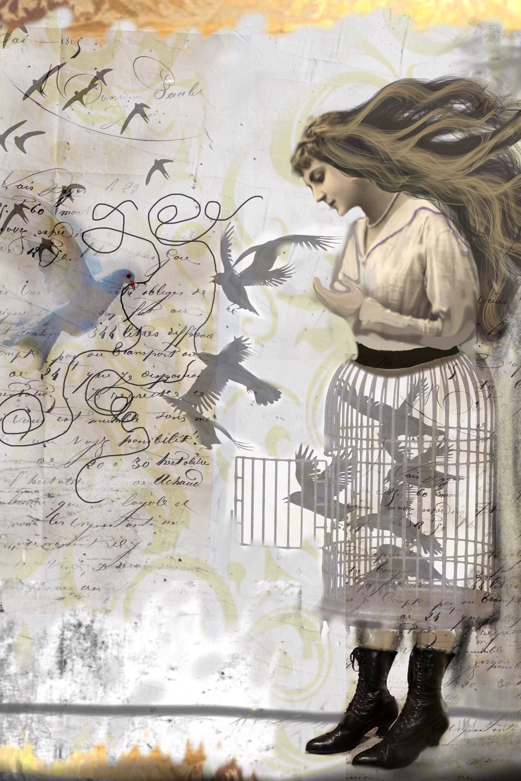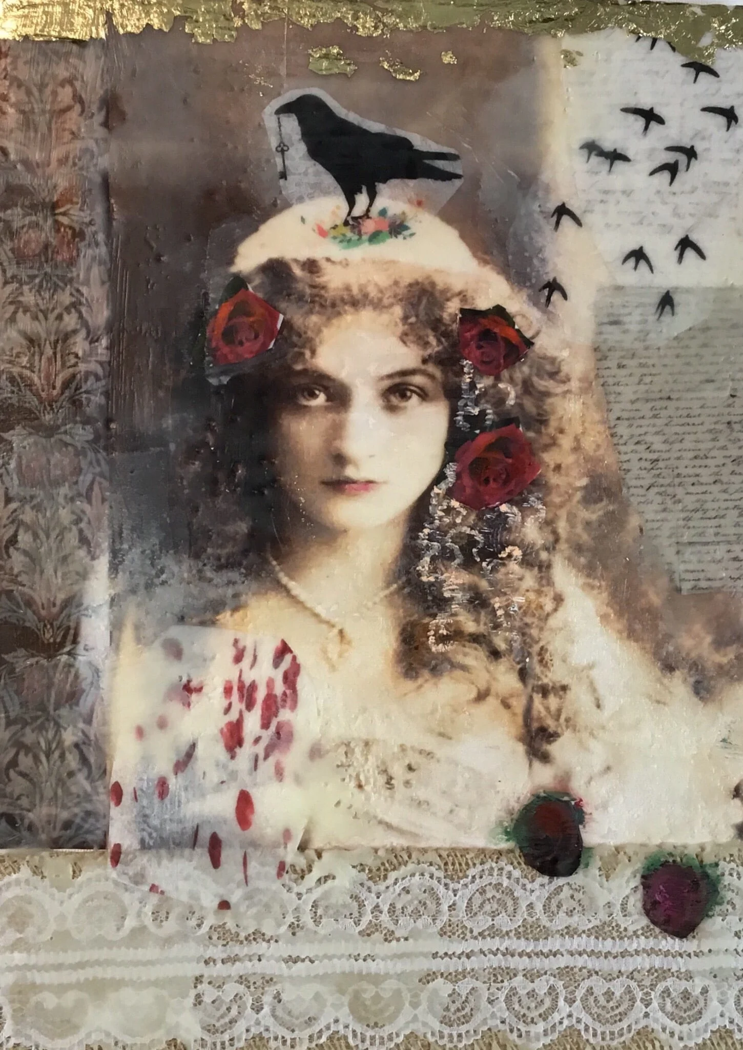 For this piece, you will use imagery to create a whimsical vintage Theme . You will use oil paint, oil pastels, gold leaf, lace, and more…..in combination with photo and copyright free imagery , creating a unique and beautiful piece of mixed media & encaustic art!
